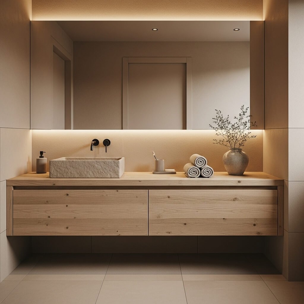 Japandi design combines Japanese minimalism with Scandinavian comfort, resulting in a bathroom that feels deeply calming. Neutral earth tones—sand, clay, and soft taupe—set the mood, while natural materials like wood, stone, and linen bring texture.