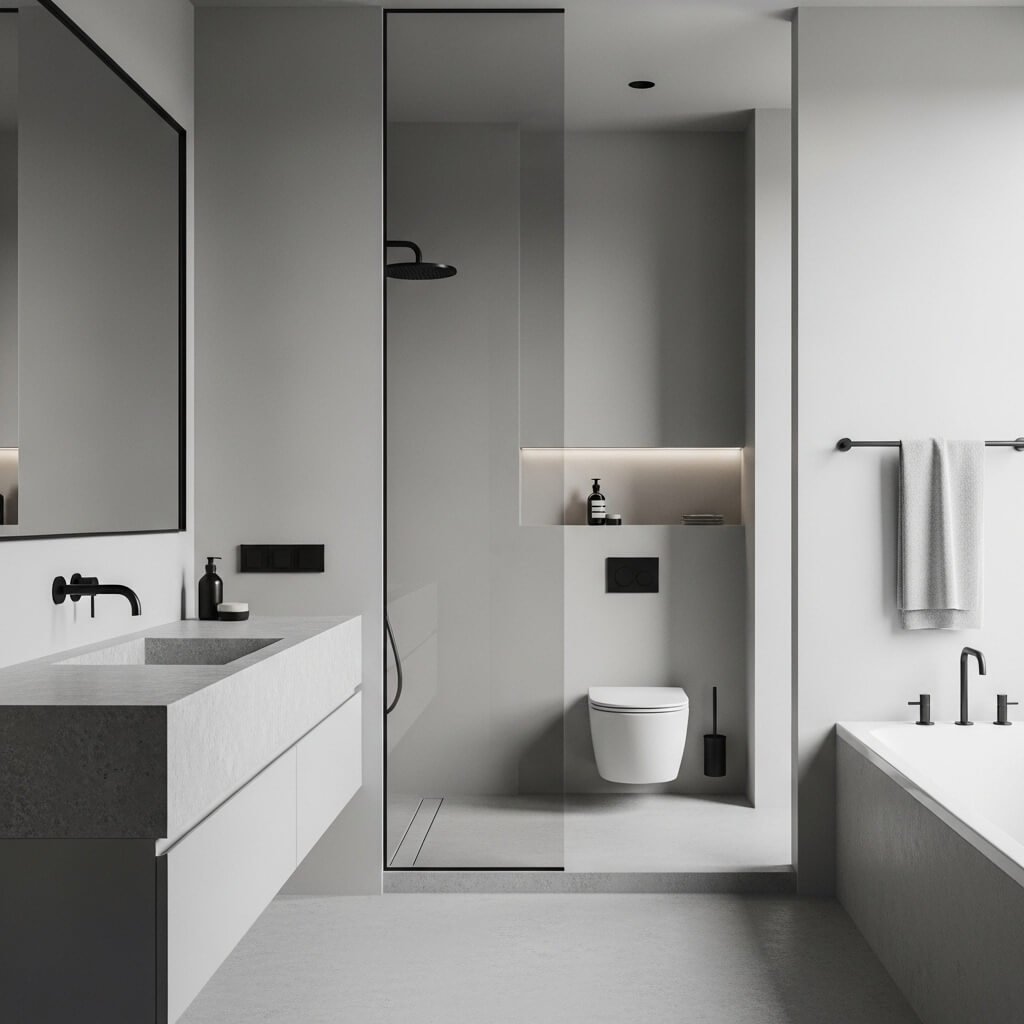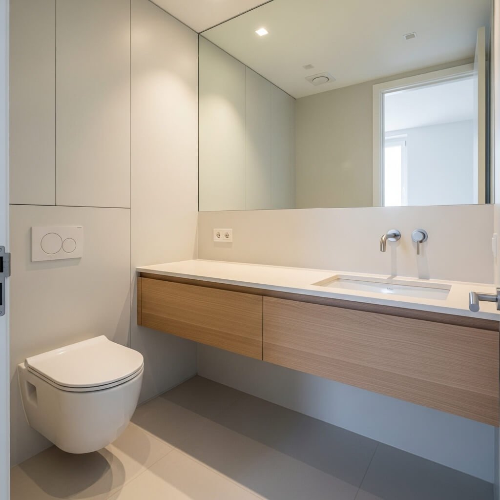 Small bathrooms benefit immensely from minimalist design. Wall-mounted fixtures, compact vanities, and light colors work together to maximize space. Mirrors are used strategically to reflect light and visually expand the room.