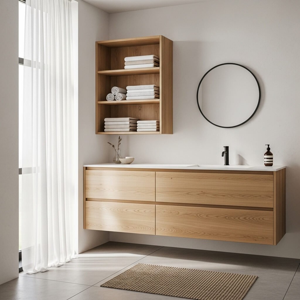 Floating vanities are a minimalist favorite for good reason. By lifting the vanity off the floor, you instantly create the illusion of more space. The visible floor area allows light to flow freely, making the bathroom feel lighter and more open.