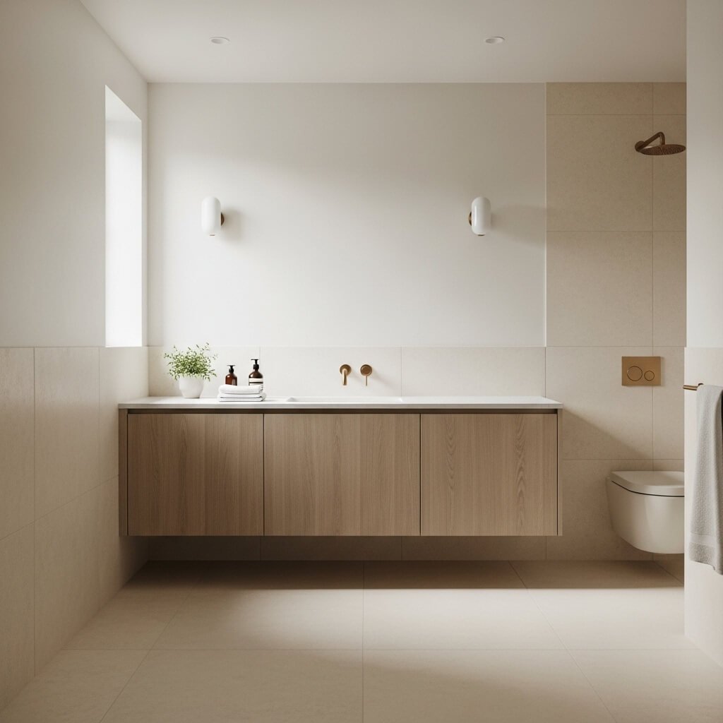A soft neutral bathroom is one of the easiest ways to achieve a calm, spacious feel. Think warm whites, creamy beiges, and subtle greige tones layered together to create depth without visual noise. This design relies on gentle color transitions rather than contrast, allowing the eye to move freely around the space.