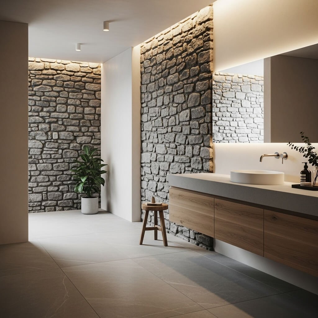 Minimalism doesn’t mean flat or boring. Texture-based bathrooms use subtle material contrasts—such as rough stone against smooth plaster or matte tiles paired with natural wood—to add interest without clutter.