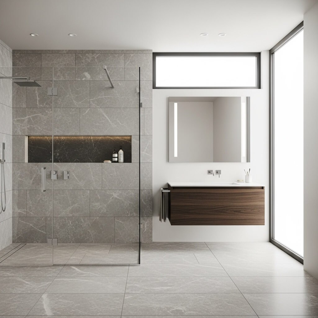 A walk-in shower with clear glass panels keeps sightlines uninterrupted, which is key in minimalist design. Frameless glass allows the shower area to blend seamlessly into the rest of the bathroom, eliminating visual barriers