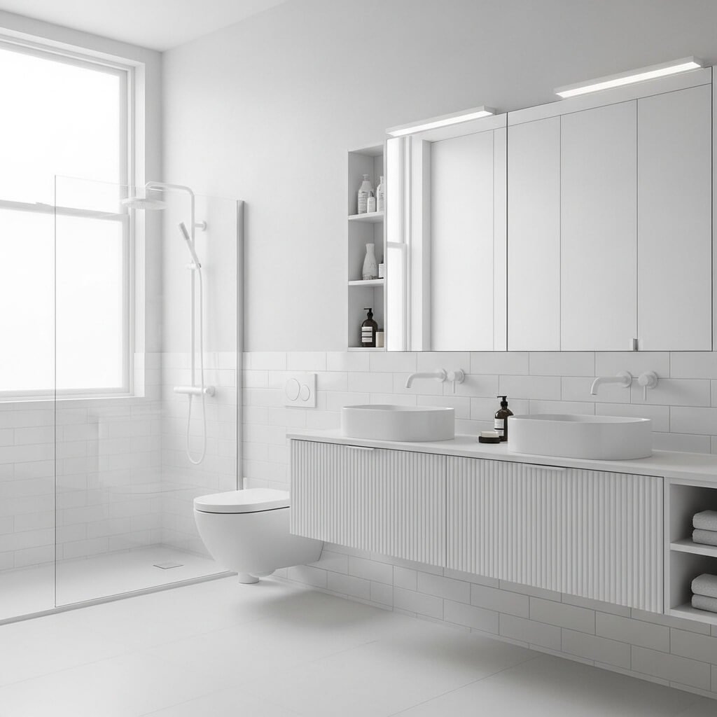 A white-on-white bathroom may sound simple, but when done right, it’s incredibly powerful. Different shades of white—warm ivory, crisp snow, soft cream—are layered to add depth. Texture becomes the star here, from subway tiles to plaster walls or ribbed cabinetry.