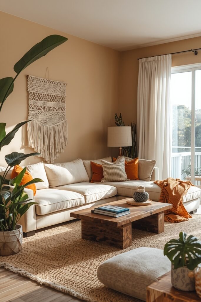 If you prefer a clean and modern style, minimal elegant boho living room ideas are a perfect choice. Instead of filling the room with too many decorations, focus on a few statement pieces that highlight the bohemian aesthetic. A neutral sofa, a wooden coffee table, and a soft textured rug can create a beautiful base for the design. Add a macrame wall hanging or simple woven wall decor to introduce the boho style without making the space feel crowded. Light-colored walls and natural lighting help maintain a bright and open atmosphere. A few indoor plants can also enhance the design while keeping the room fresh and lively. This approach blends modern living room decor with boho style, creating a balanced look that feels elegant, stylish, and comfortable for everyday living.