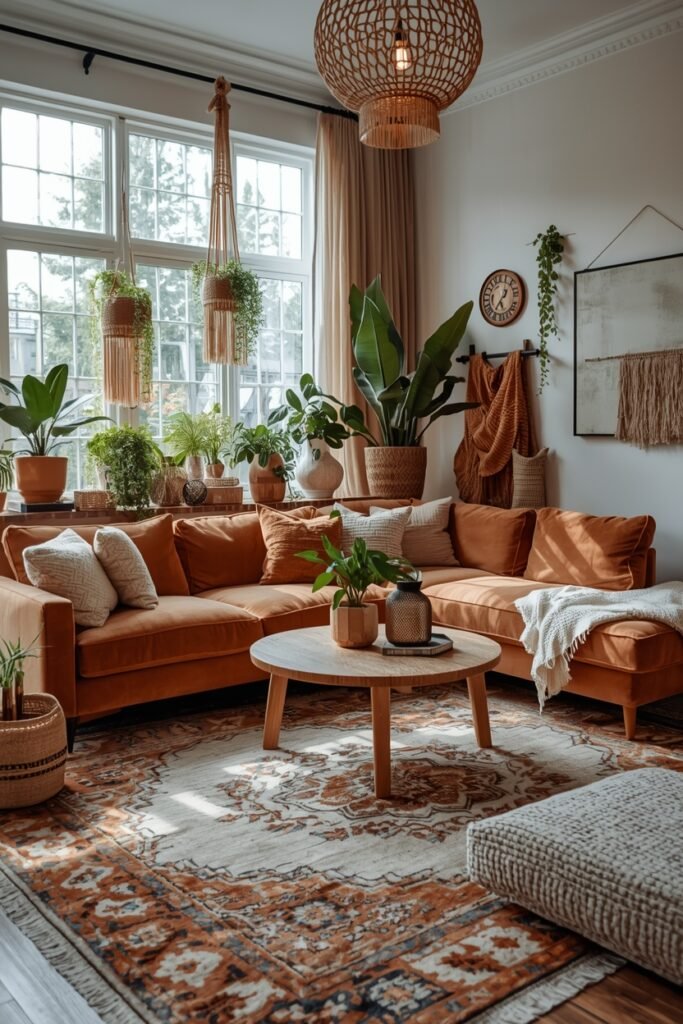 Warm earth tones are perfect for creating elegant boho living room ideas that feel cozy and inviting. Colors such as terracotta, rust, caramel, and warm beige bring depth and character to the space. A rust-colored sofa paired with natural wood furniture can instantly create a stylish focal point. Layering textured elements like jute rugs, woven poufs, and linen cushions helps add warmth and dimension. Decorative pieces such as pampas grass, ceramic vases, and woven wall art enhance the boho atmosphere while maintaining an elegant look. Soft lighting from floor lamps or pendant lights can further highlight the warm tones in the room. This design style works beautifully for homeowners who want a boho living room decor that feels relaxed, stylish, and welcoming while still maintaining a refined and elegant interior design.